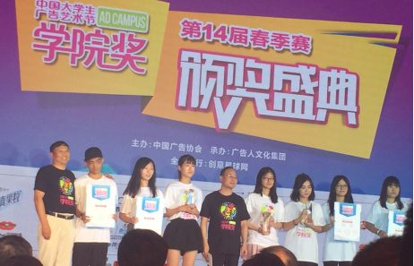 在第十四届全国大学生广告艺术节学院奖春季赛中,我校艺术与传媒学院2013级广告专业学生韦滢铃、陈佳琪等三位同学获葫芦娃药业策划类金奖。江玉莹、张婕、陈晓蕾三位同学获得京润珍珠影视广告类银奖。另有陈欢、任诗韵等二十名同学分别获得了优秀奖和佳作奖。图为我校广告学专业同学参加的在北京中央电视台梅地亚中心隆重举行的颁奖盛会。
