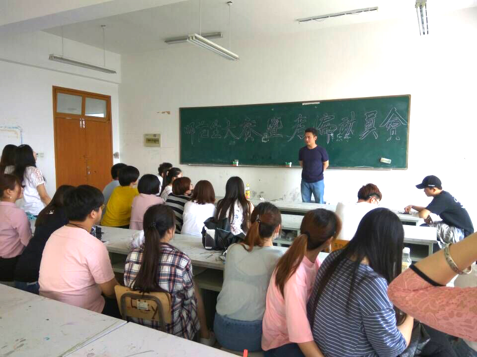 5月13日下午两点,我院美术系主任邵士德老师在美术楼6309画室召开师范生教学基本功大赛和考编动员会 ,14级美术师范专业全体同学参加。
