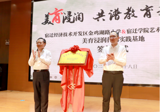 在签约仪式上,陈虎书记与杜利强书记共同为“美育浸润行动实践基地”揭牌,与王建校长签署了双方合作协议。此次合作,宿迁学院艺术与传媒学院将把51个艺术实践分室转化为基础教育“美育实验室”,46个校内外基地转化为“行走的艺术课堂”,为宿迁经开区金鸡湖路小学的美育教育注入新的活力。