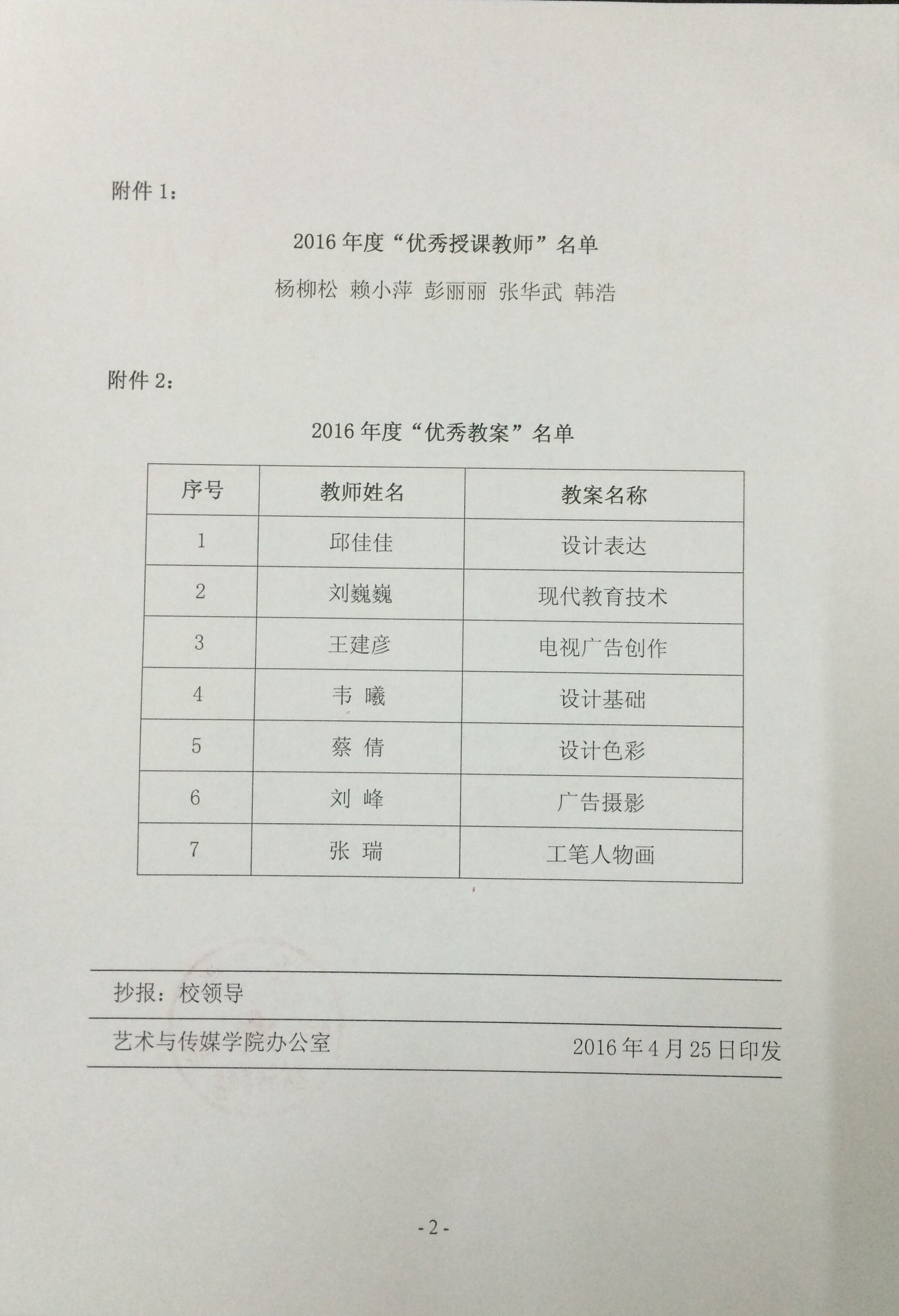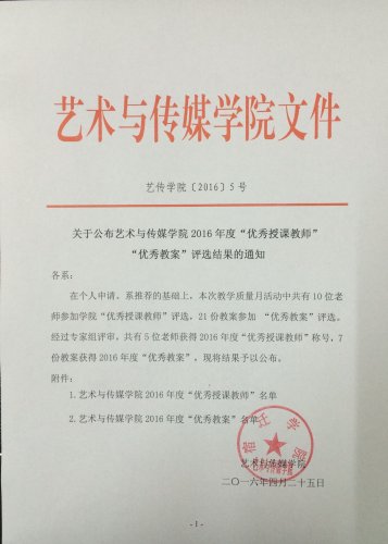 关于公布艺术与传媒学院2016年度“优秀授课教师”“优秀教案”评选结果的通知