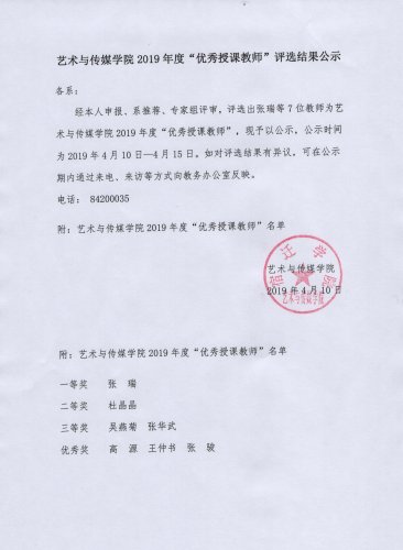 艺术与传媒学院2019年度“优秀授课教师”评选结果公示