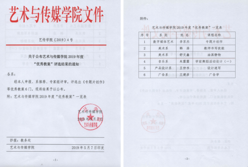 关于公布艺术与传媒学院2019年度“优秀教案”评选结果的通知