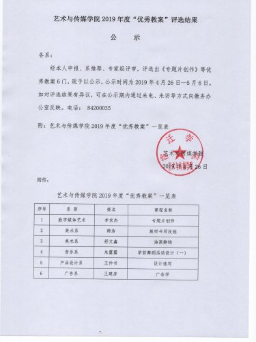 艺术与传媒学院2019年度“优秀教案”评选结果公示