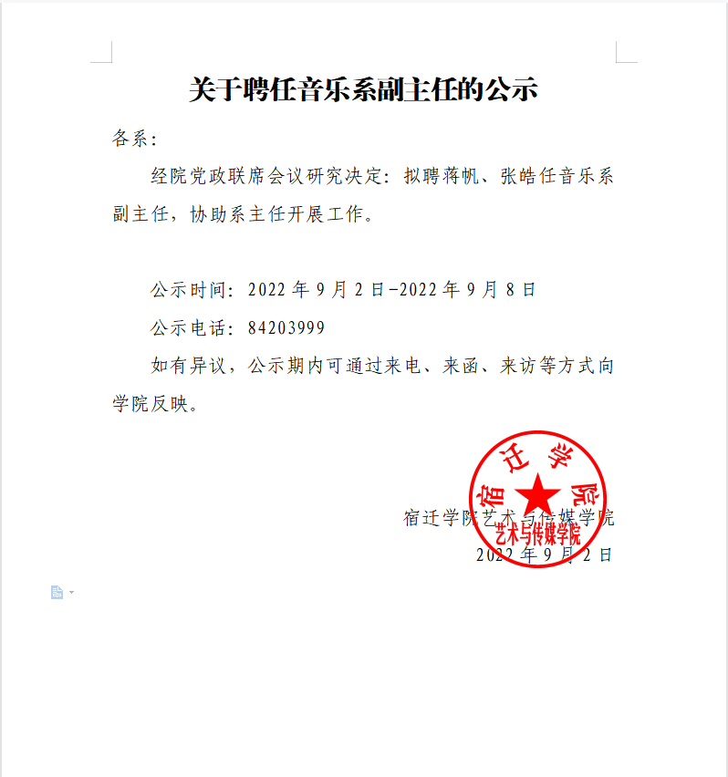 关于聘任音乐系副主任的公示