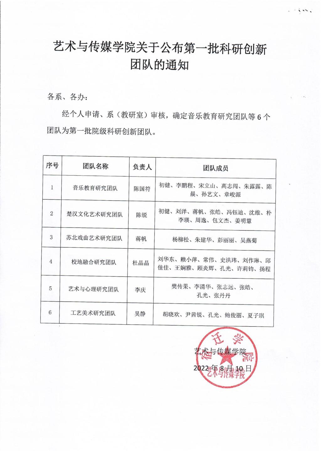 艺术与传媒学院关于公布第一批科研创新团队的通知