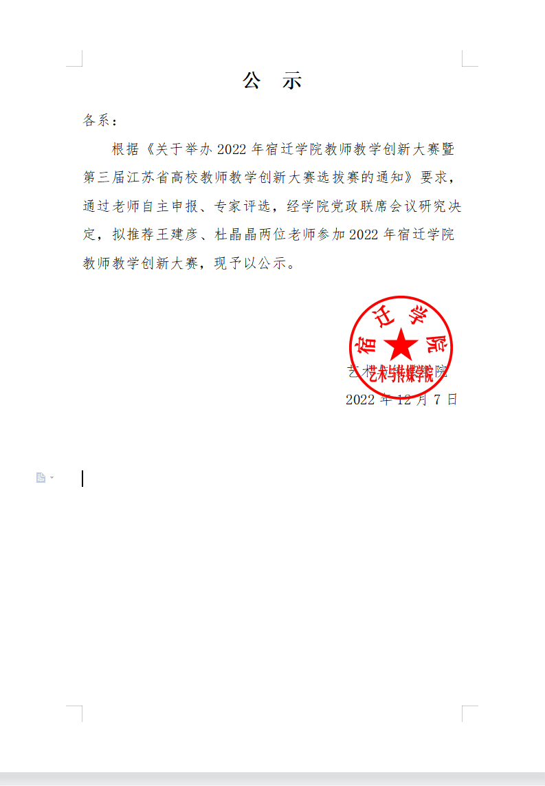 关于教师教学创新大赛推荐参赛人选的公示