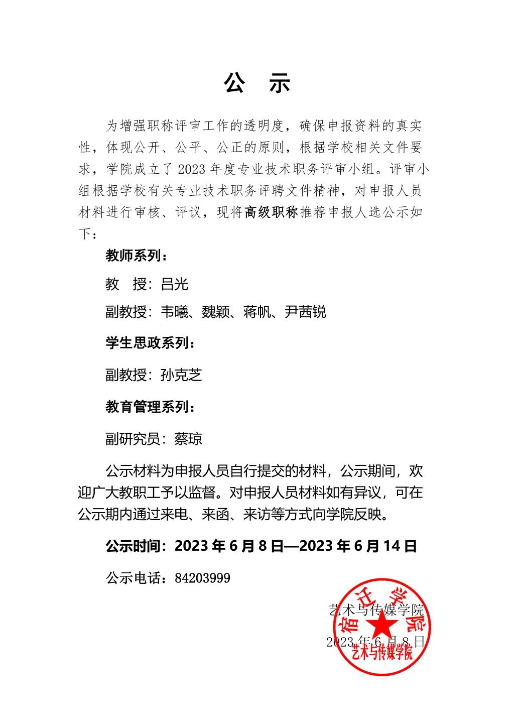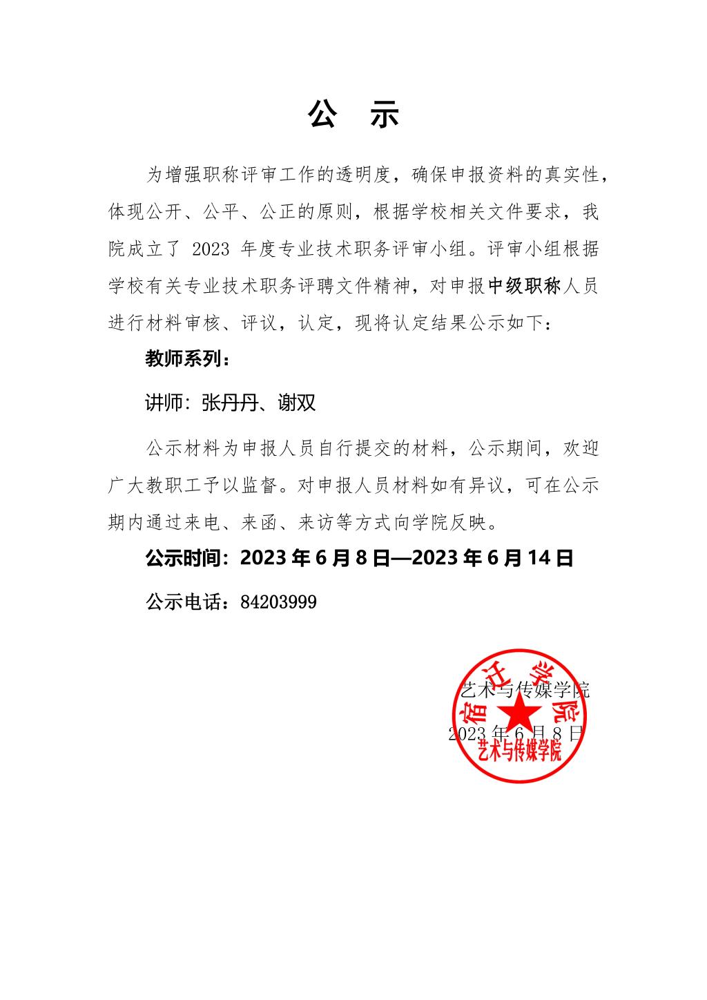 2023年度中高级专业技术职务评议(审)结果公示