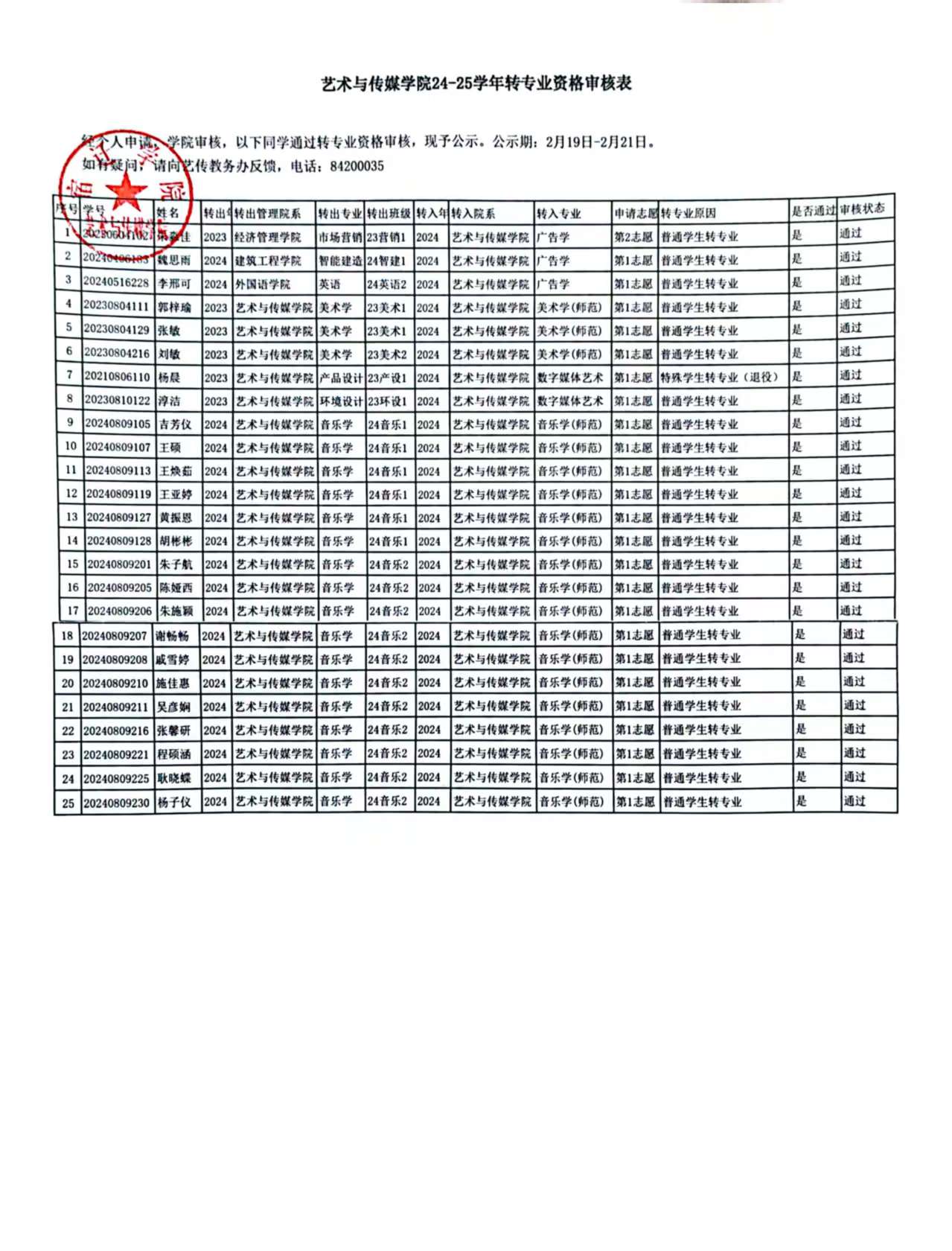 艺术与传媒学院24-25学年转专业资格审核结果公示