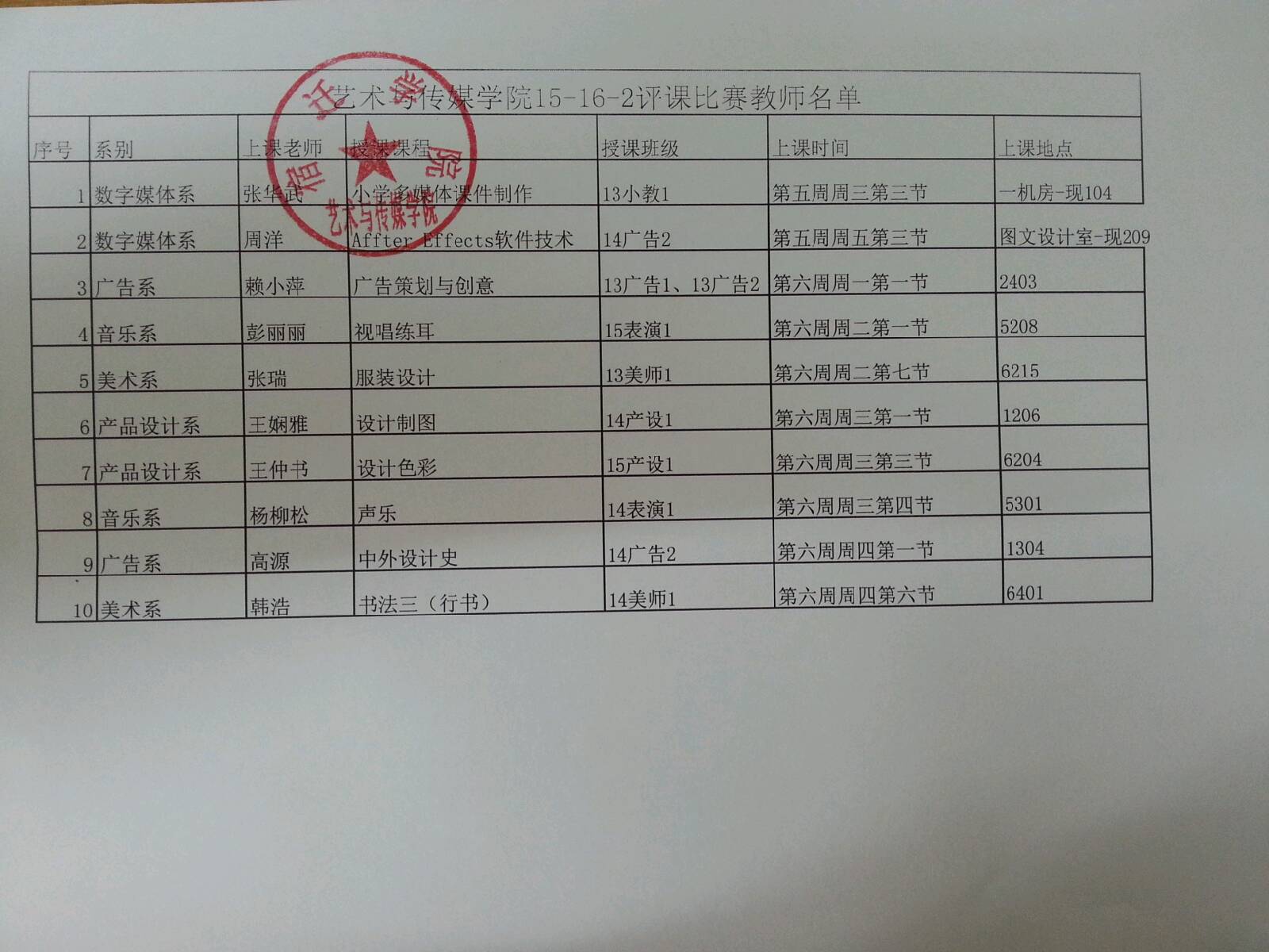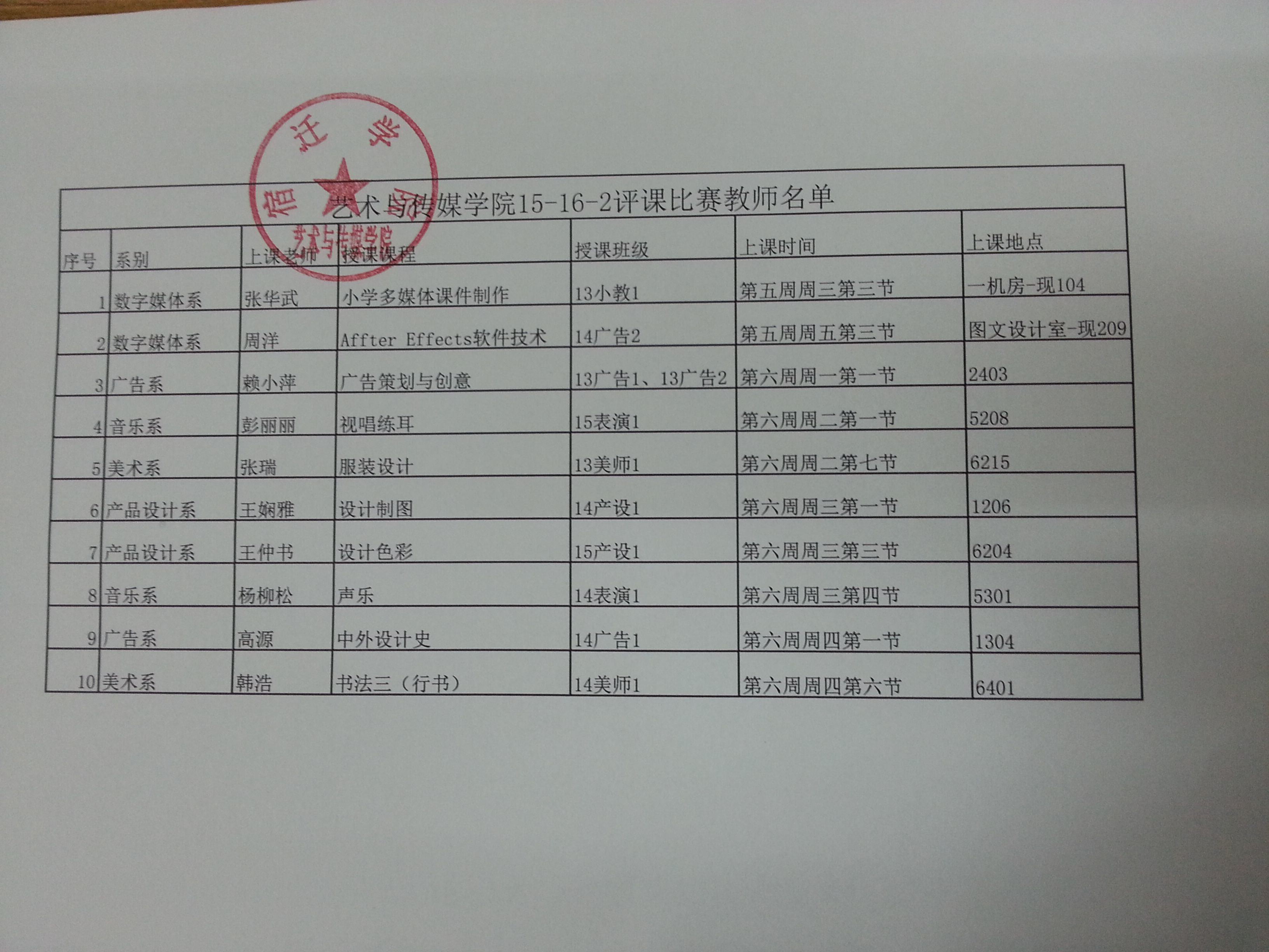 教学质量月专题活动-艺术与传媒学院15-16-2学期评课比赛教师名单
