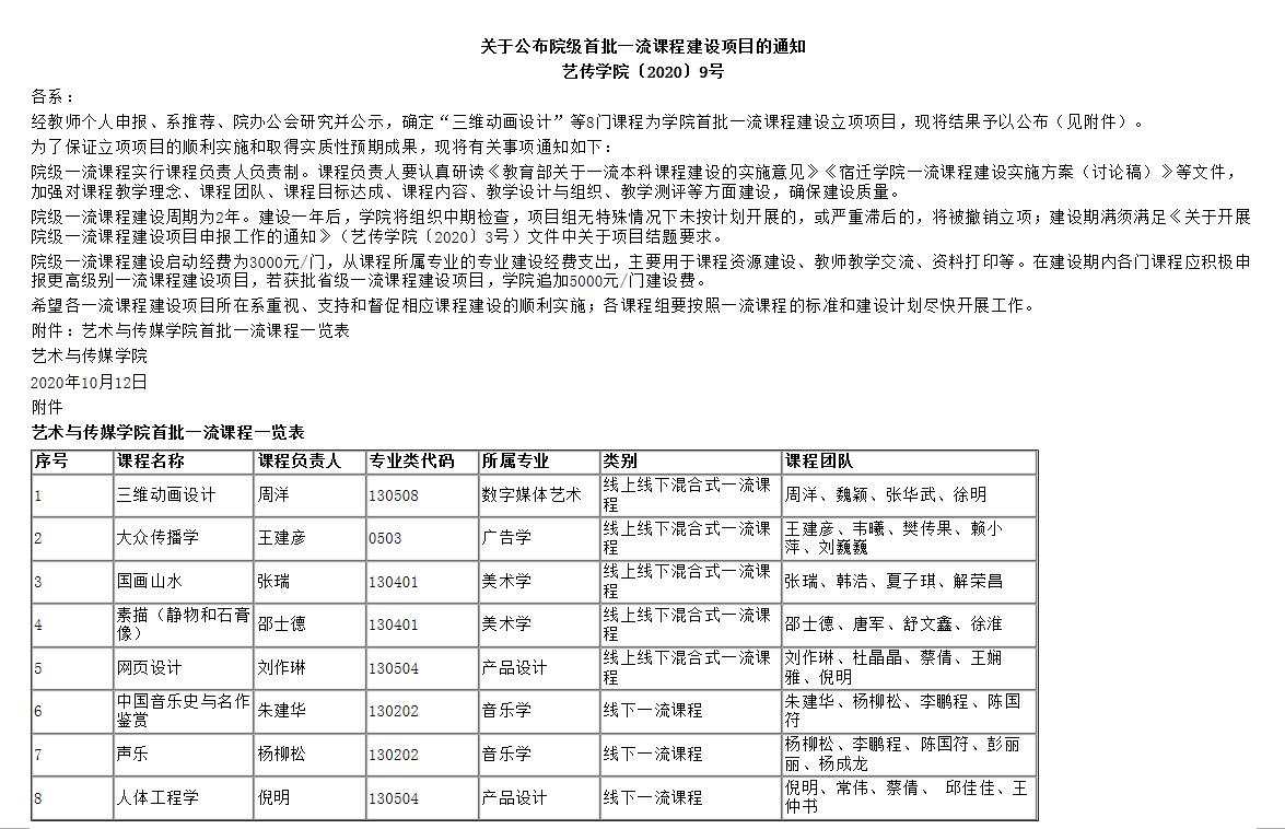 关于公布院级首批一流课程建设项目的通知