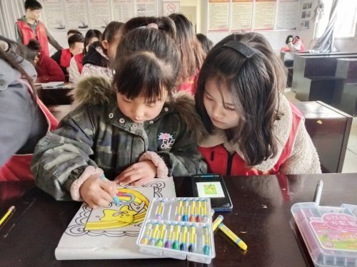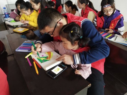活动伊始,由小火柴志愿服务队队员徐金逸向在场的小朋友们介绍了此次活动的流程,并要求孩子们自己组成小组,每组派出一个代表到讲台上领取自己喜欢的绘画工具。紧接着,小火柴志愿服务队的志愿者们便开始了有条不紊的志愿工作——志愿者们依次有序地坐在小朋友的旁边,认真指导,耐心地给孩子们做示范,一笔一画的握着画笔教他们勾勒出各式各样的线条与框架。每一个小朋友都全身心投入课堂,专心致志地听着志愿者给他们的讲解,不禁自己拿起手中的笔小心翼翼地学着勾线、涂画,然后选择自己喜欢的颜色在白色的画纸上留下五彩斑斓的颜色……当孩子们看到自己的画逐渐地变得丰富充实时,他们的小脸蛋上便会洋溢着甜甜的微笑。在晨光的照耀下,透过窗户,孩子们的微笑显得格外温暖……活动最后,孩子们都迫不及待地拿着自己完成的作品与小火柴志愿服务队的成员们合影留念。短暂的两个小时志愿活动,大家都在欢声笑语之中度过,彼此之间也建立了深厚的友谊。