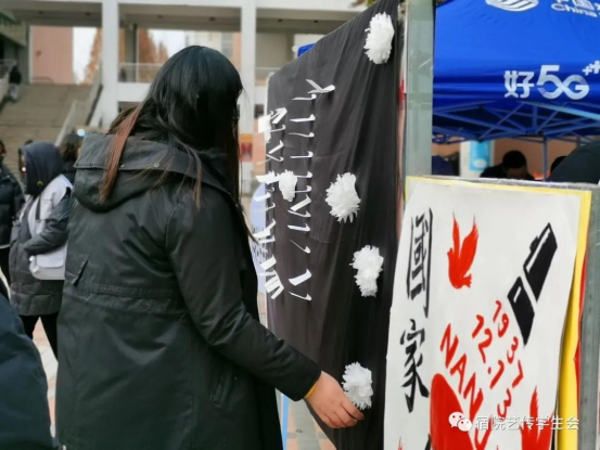 我们为南京大屠杀死难者举行公祭仪式不是要为了延续仇恨,而是为了唤起我们对和平的向往和坚守,同时也为了祭奠先烈们。艺术与传媒学院学生会的志愿者们主动教大家叠起了小白花,同学们都踊跃参与了进来。忘记历史,必将重蹈覆辙。我们不能忘记作为社会的一份子,我们应当铭记历史、砥砺前行。仇恨不会增长,时间可以消逝,但记忆永远不会风化,耻辱更是不容漫长的沉痛所尘封。为了纪念与哀悼英雄烈士们,大家纷纷签上了自己的名字。