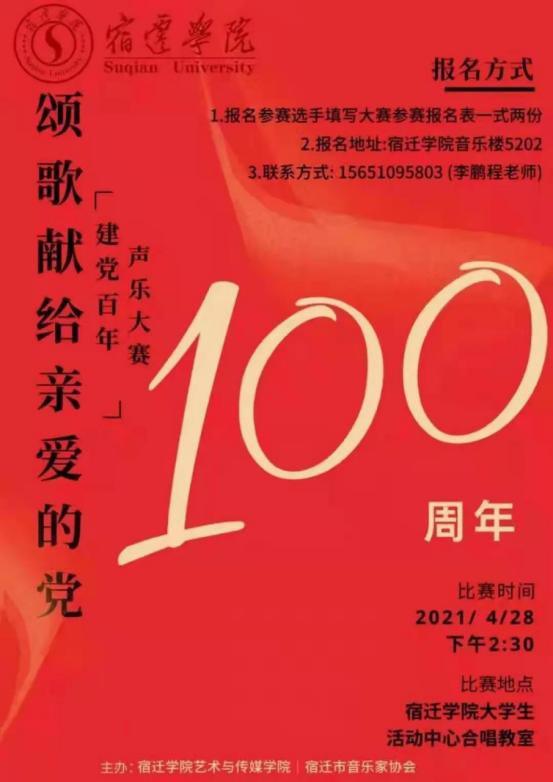 叁——颂歌献给亲爱的党——建党百年声乐大赛,主办方:宿迁学院艺术与传媒学院、宿迁市音乐家协会,比赛时间 : 2021.4.28,14:30,地点:宿迁学院大学生活动中心合唱。