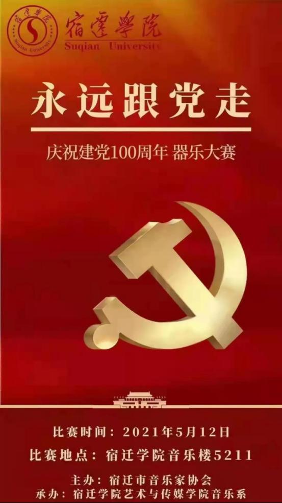 肆——永远跟党走——庆祝建党100周年器乐大赛,主办:宿迁市音乐家协会,承办:宿迁学院艺术与传媒学院,比赛时间:2021年5月12日,比赛地点:宿迁学院音乐楼5211。