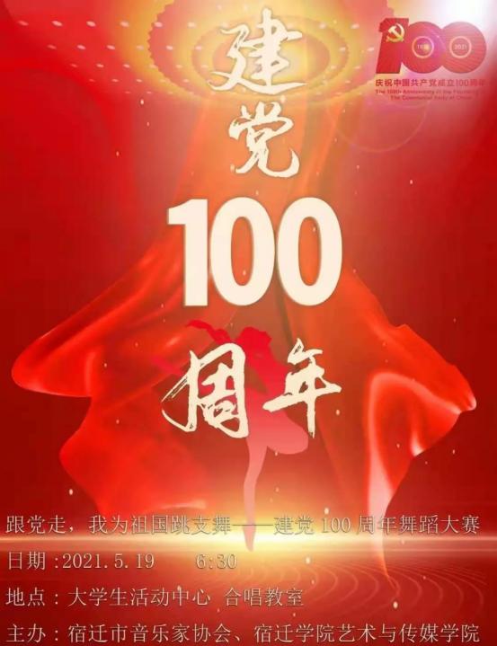 陆——跟党走,我为祖国跳支舞——建党100周年舞蹈大赛,主办:宿迁市音乐家协会,宿迁学院艺术与传媒学院,日期: 2021.5.19,6:30,地点:大学生活动中心合唱教室。