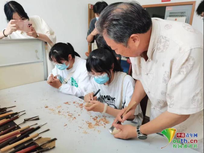 图为木雕帅氏第五代传承人帅春燕老先生带同学体验木雕之美。中国青年网通讯员黄小丫摄