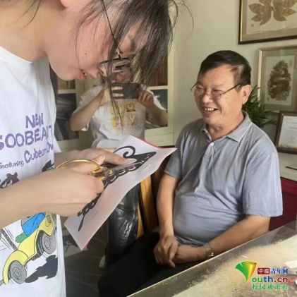图为金国荣老师让同学们体验剪纸乐趣。中国青年网通讯员朱嘉雯摄