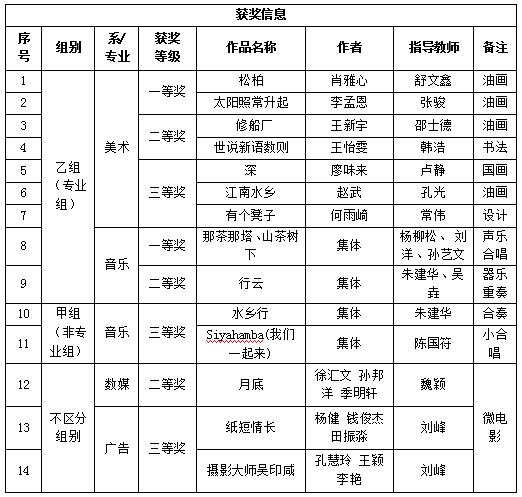 根据《省教育厅关于举办江苏省第六届大学生艺术展演活动的通知》(苏教体艺函〔2019〕32 号)精神,本届大艺展艺术作品共收到全省高校参评作品1371件。经过评委组遴选,全省共有340件作品入围,我院学子获奖14项,其中获专业组一等奖3项、二等奖3项、三等奖3项,非专业组三等奖2项,无组别二等奖1项、三等奖2项;我校获“优秀组织奖”。