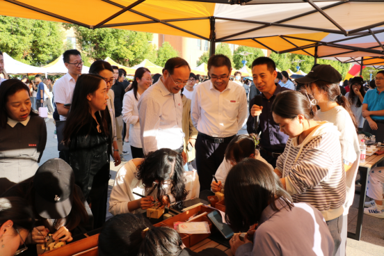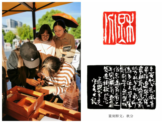 纪敏教授和徐健老师指导的篆刻团队与学生们分享了篆刻艺术,从未摸过篆刻刀的同学们,积极踊跃,共同创作了“秋分”一印,线条优美,刀趣盎然。