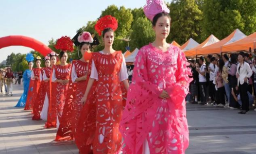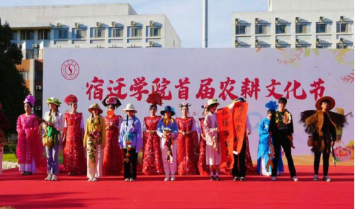 身穿剪纸服装和环保服装的同学们一步步坚定的走向舞台。并在舞台中央展示了“宿迁学院农耕文化节”书法作品。